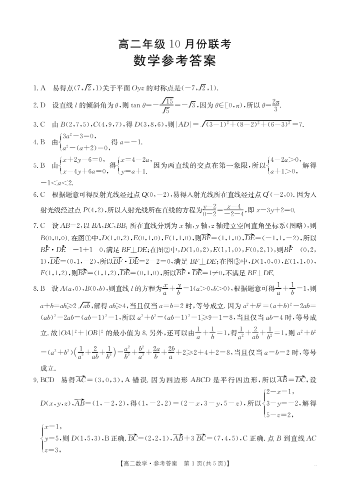 河北省部分学校2024-2025学年高二年级10月份联考数学答案