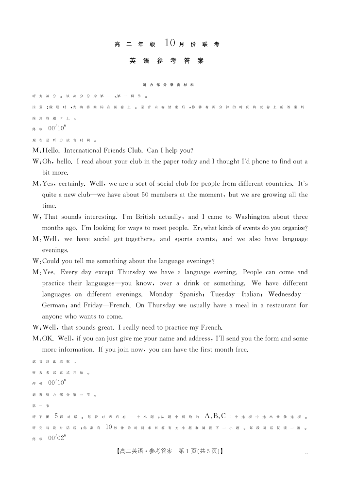 河北省部分学校2024-2025学年高二年级10月份联考英语答案