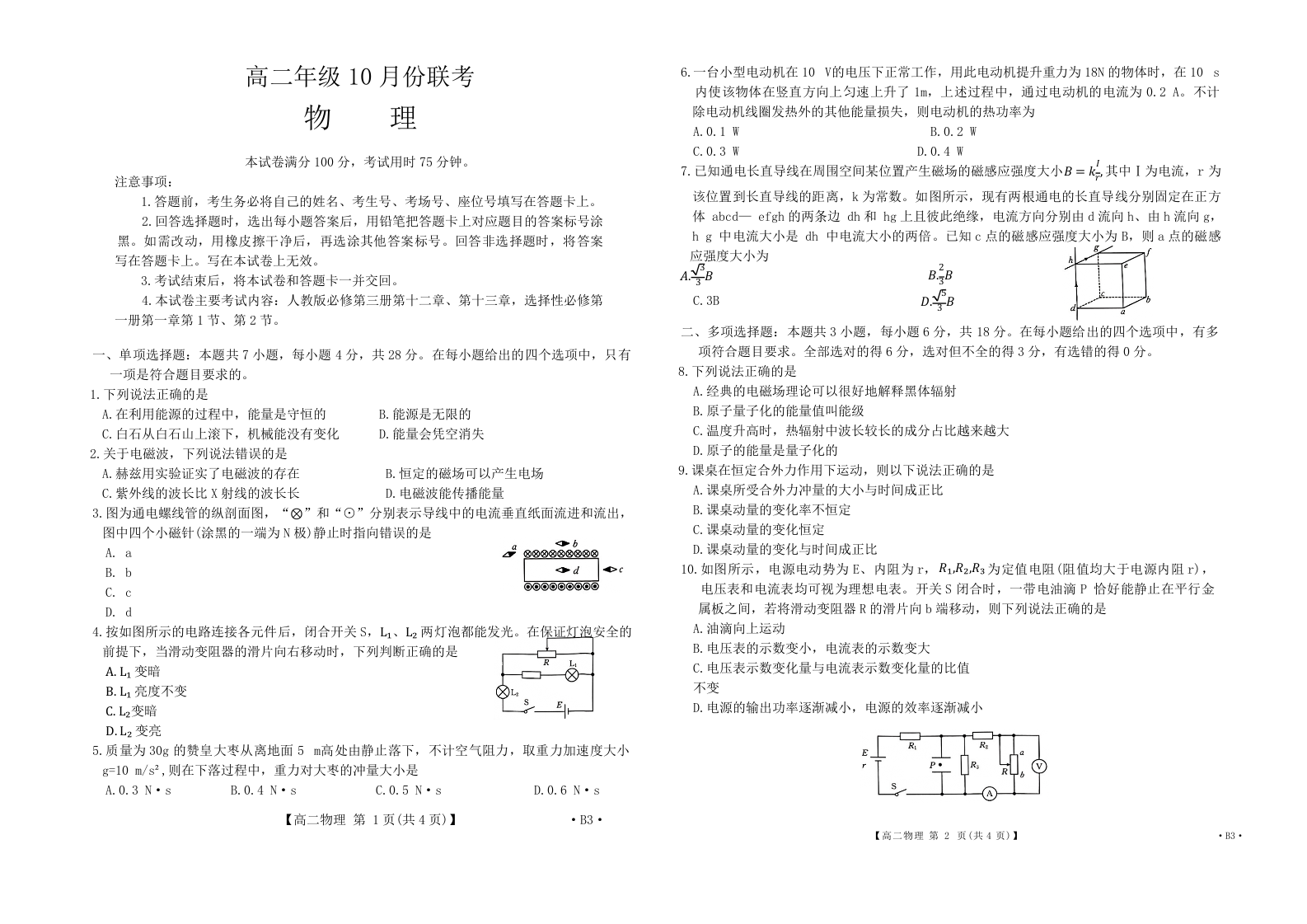 河北省部分学校2024-2025学年高二年级10月份联考物理