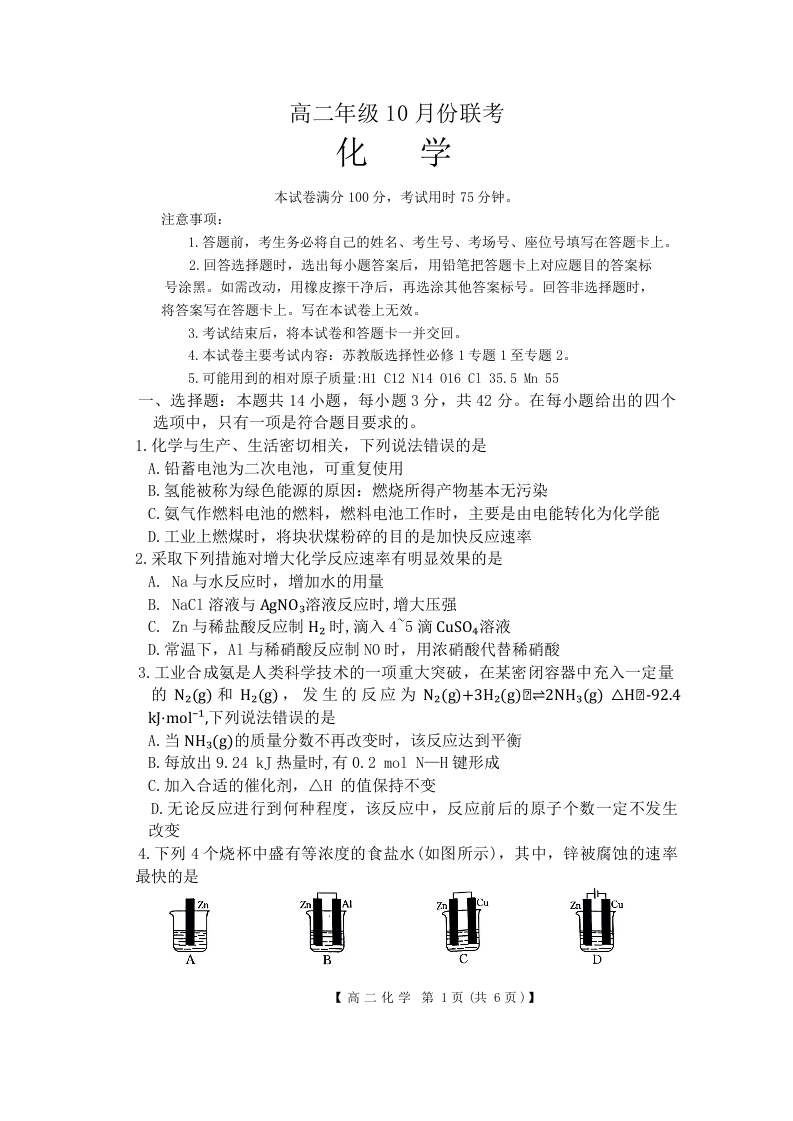 河北省部分学校2024-2025学年高二年级10月份联考化学