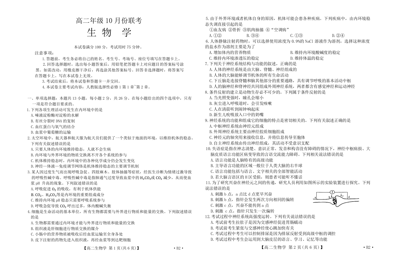 河北省部分学校2024-2025学年高二年级10月份联考生物