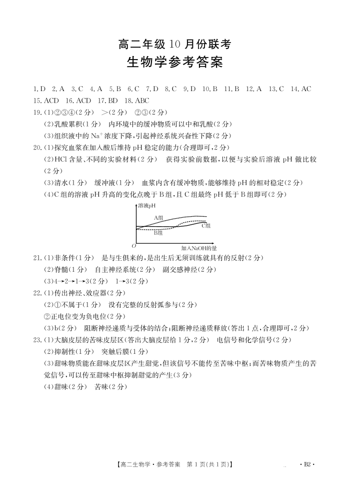 河北省部分学校2024-2025学年高二年级10月份联考生物答案