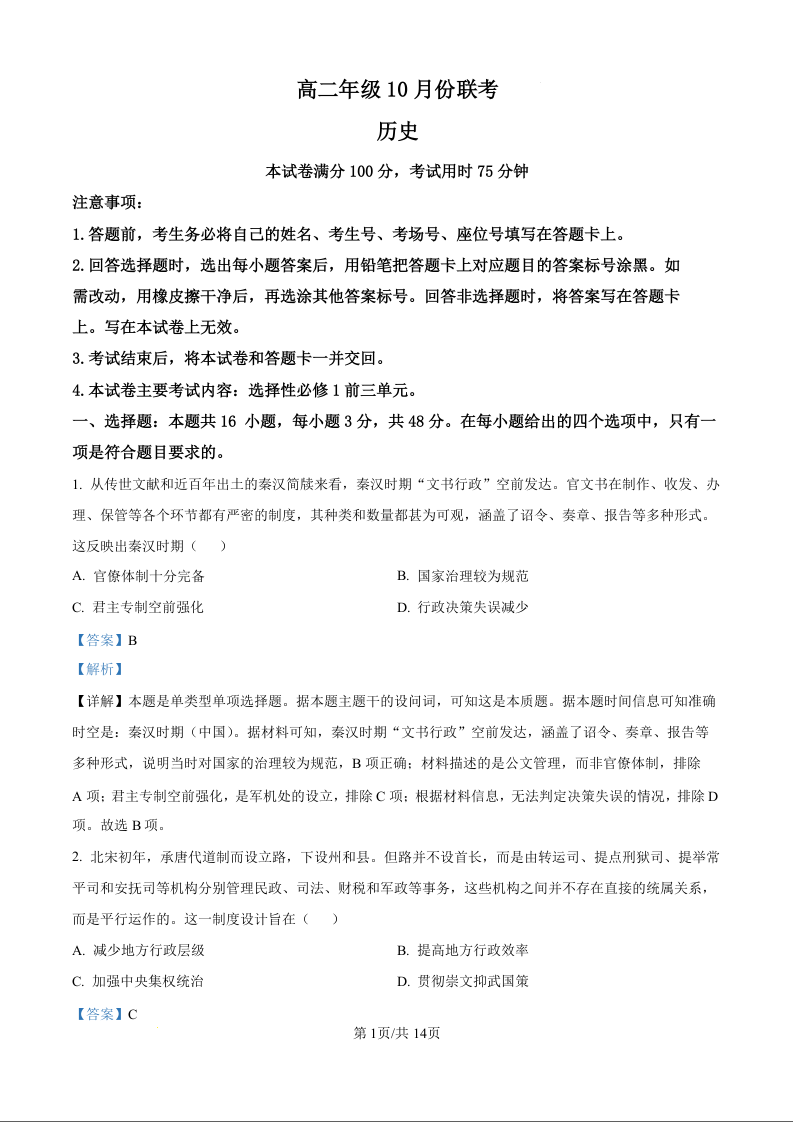 河北省部分学校2024-2025学年高二年级10月份联考历史(解析版)