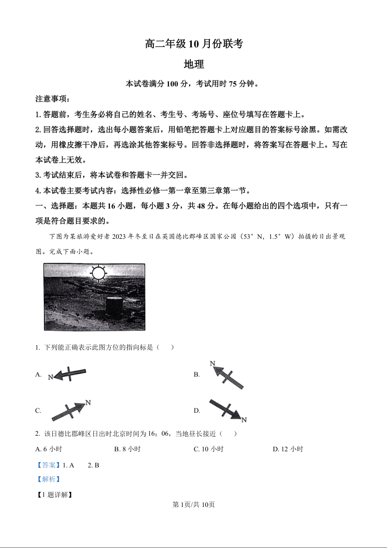 河北省部分学校2024-2025学年高二年级10月份联考地理(解析版)