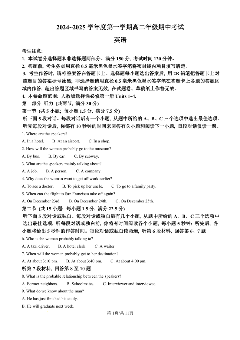 河北省沧州市八县联考2024~2025学年度第一学期高二年级期中考试英语(原卷版)