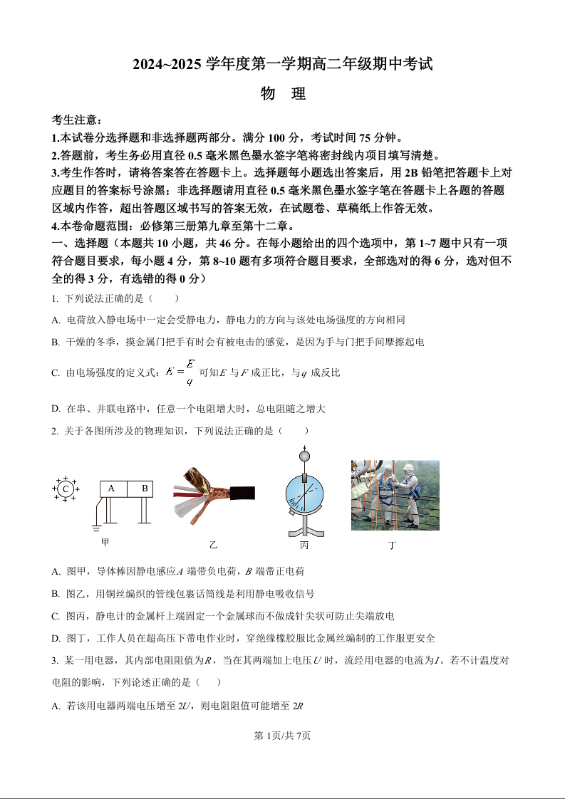 河北省沧州市八县联考2024~2025学年度第一学期高二年级期中考试物理(原卷版)