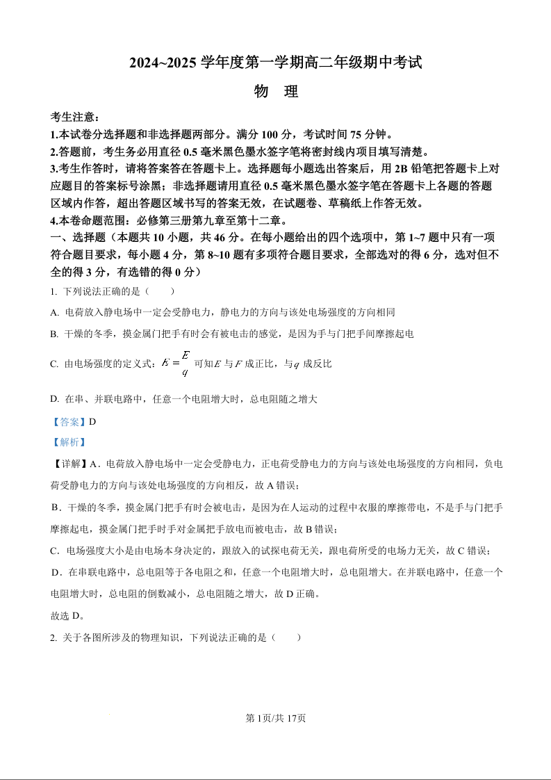 河北省沧州市八县联考2024~2025学年度第一学期高二年级期中考试物理(解析版)