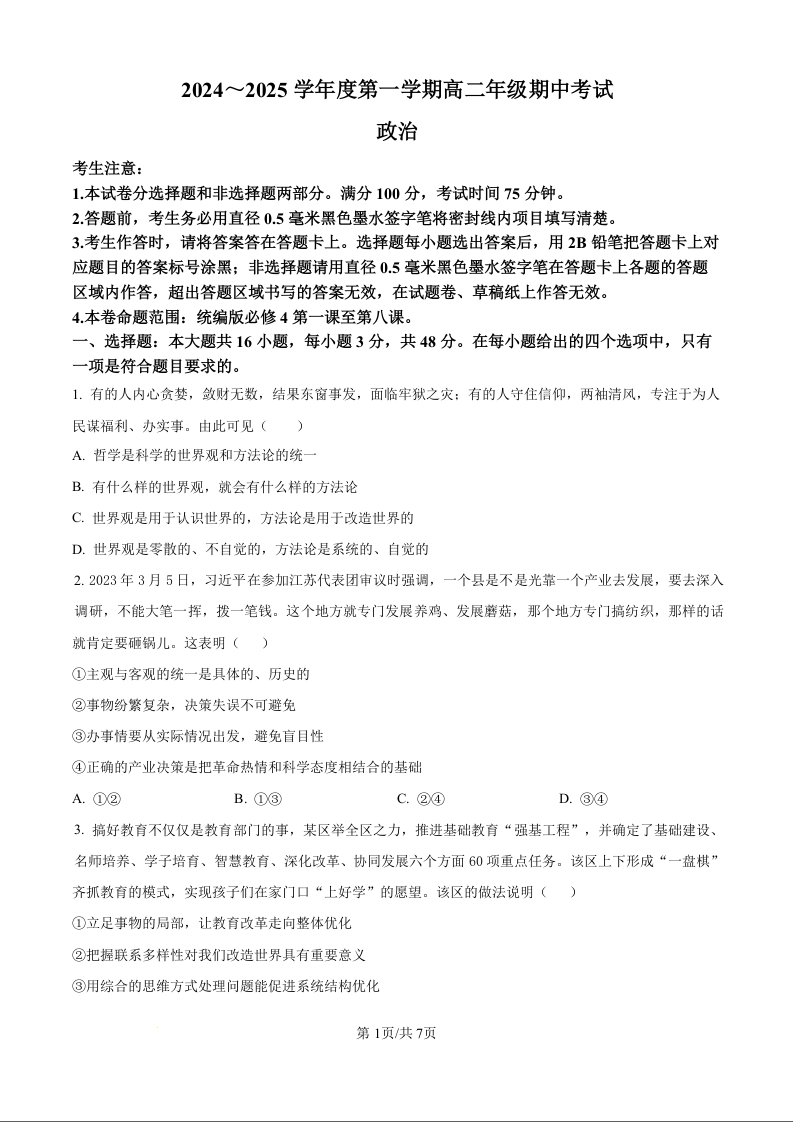 河北省沧州市八县联考2024~2025学年度第一学期高二年级期中考试政治(原卷版)