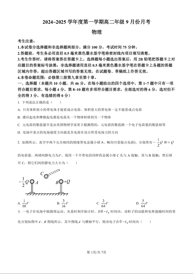 河北省沧州市部分学校2024~2025学年度第一学期高二年级9月份月考物理(原卷版)
