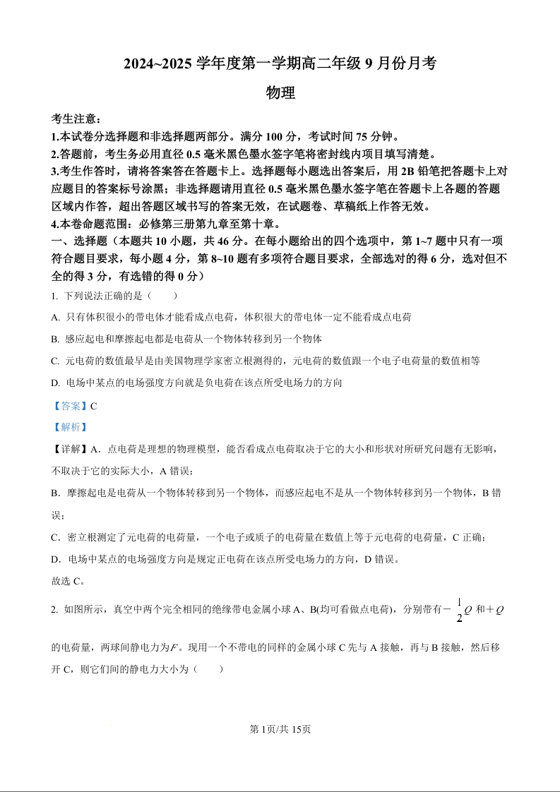 河北省沧州市部分学校2024~2025学年度第一学期高二年级9月份月考物理(解析版)