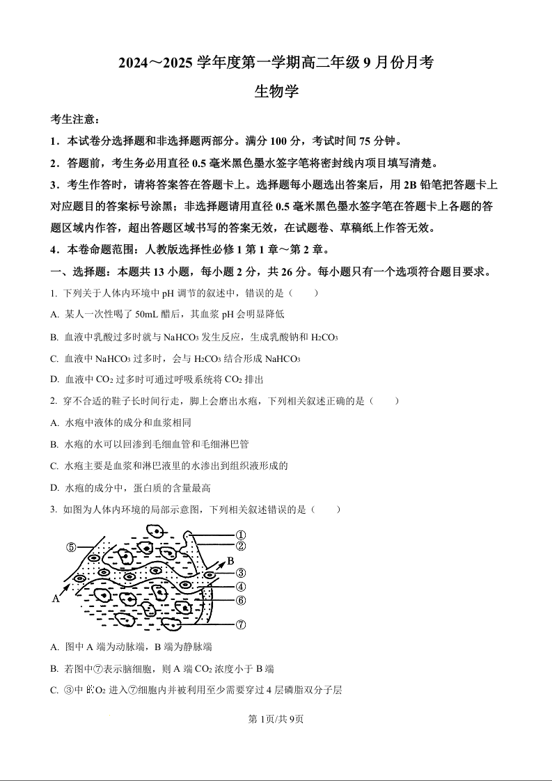 河北省沧州市部分学校2024~2025学年度第一学期高二年级9月份月考生物(原卷版)