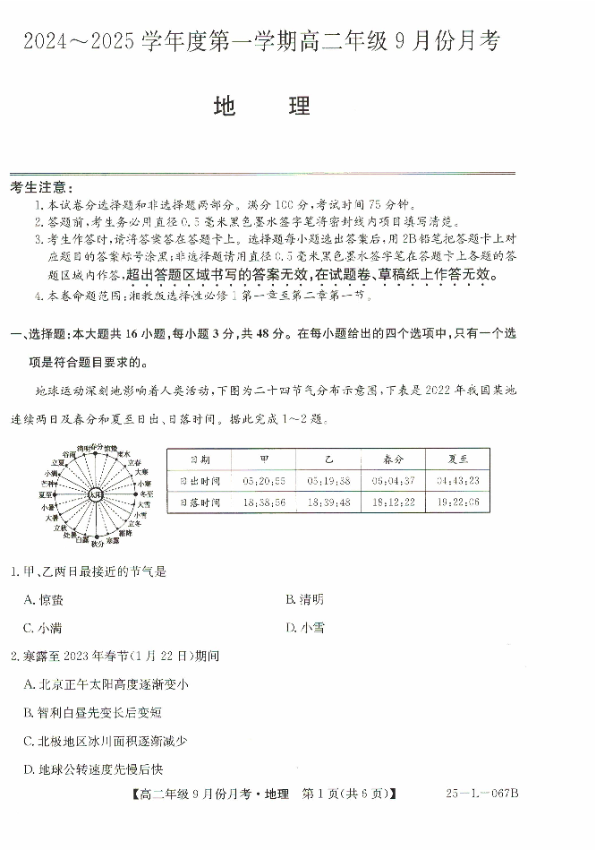河北省沧州市部分学校2024~2025学年度第一学期高二年级9月份月考地理