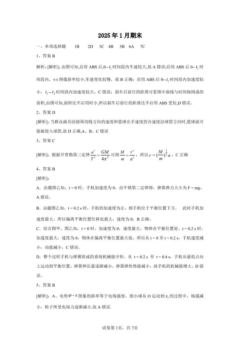 山西省吕梁市2025届高三上学期1月期末调研考试物理答案
