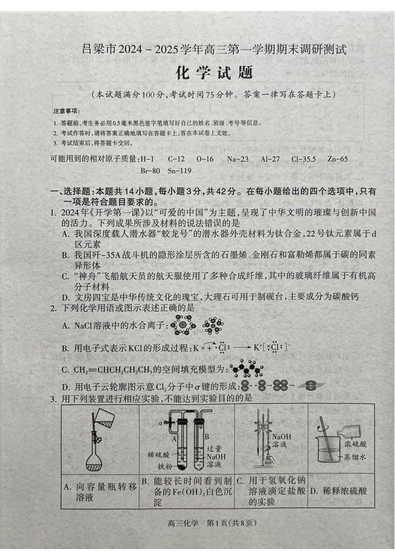 山西省吕梁市2025届高三上学期1月期末调研考试化学