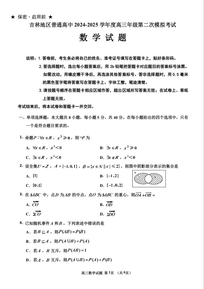 吉林省普通中学2024-2025学年上学期高三第二次调研测试数学