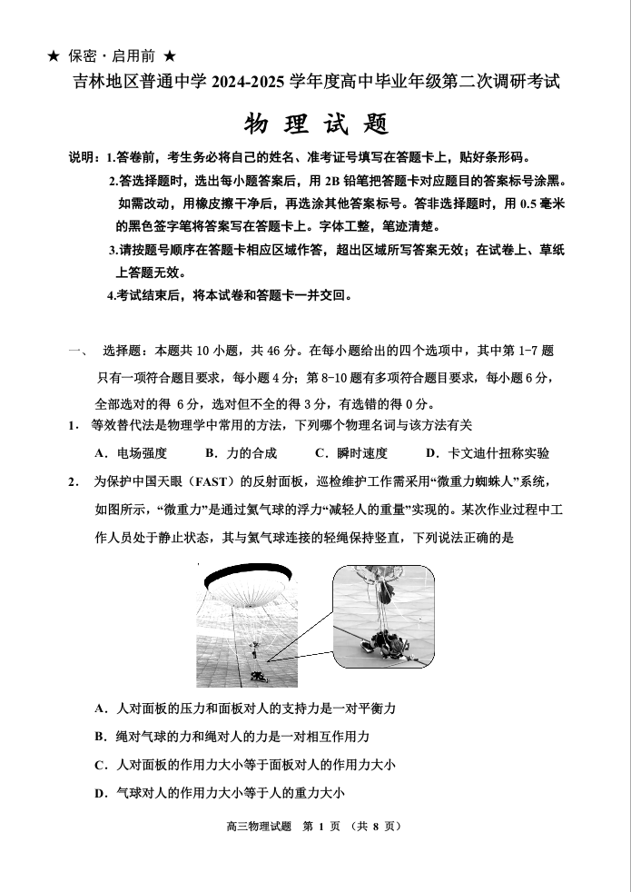 吉林省普通中学2024-2025学年上学期高三第二次调研测试物理