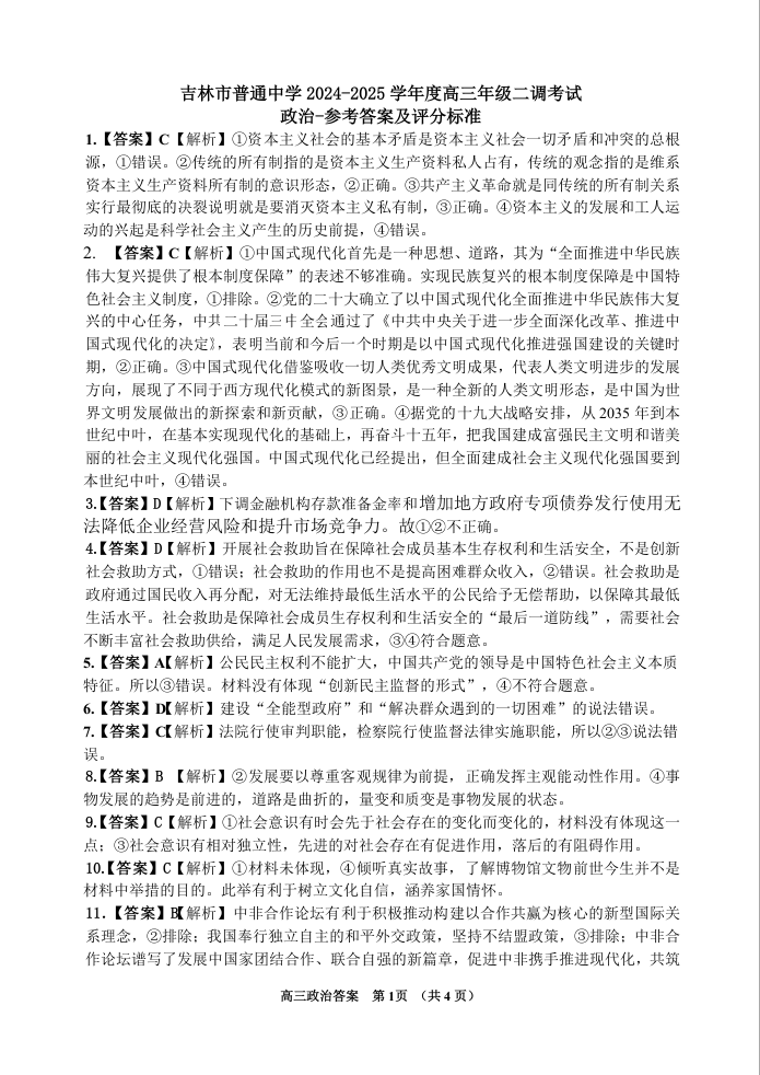 吉林省普通中学2024-2025学年上学期高三第二次调研测试政治答案