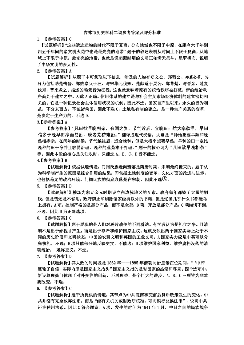 吉林省普通中学2024-2025学年上学期高三第二次调研测试历史答案
