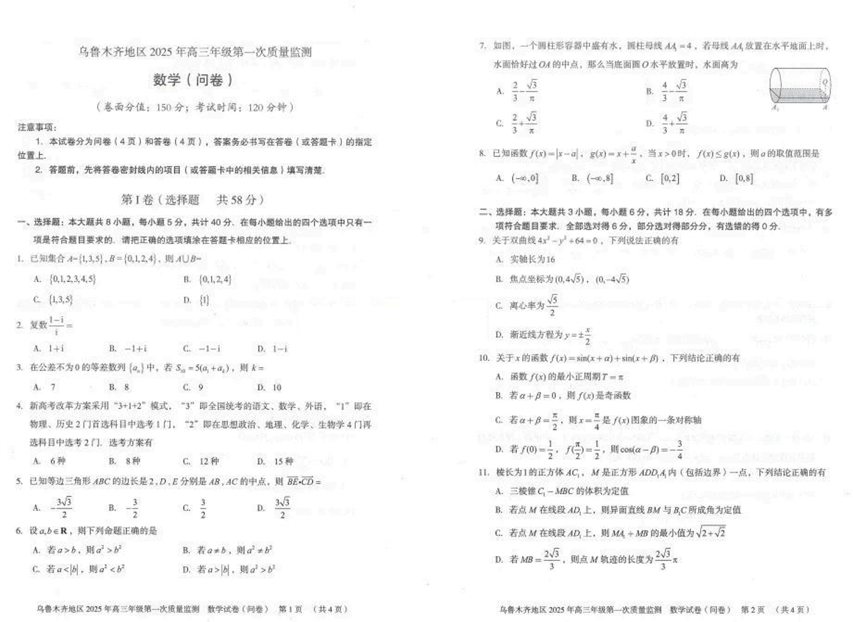 新疆乌鲁木齐地区2024-2025学年上学期高三第一次质量监测数学