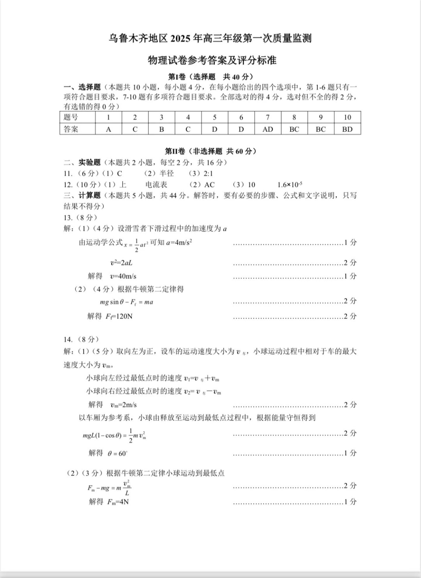 新疆乌鲁木齐地区2024-2025学年上学期高三第一次质量监测物理答案