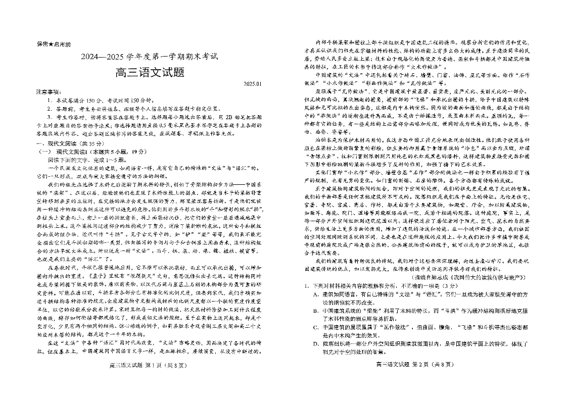 山东省菏泽市2024-2025学年上学期上学期1月高三期末考试语文