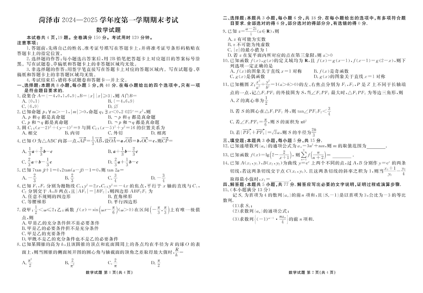 山东省菏泽市2024-2025学年上学期上学期1月高三期末考试数学