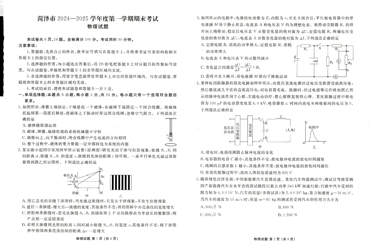 山东省菏泽市2024-2025学年上学期上学期1月高三期末考试物理