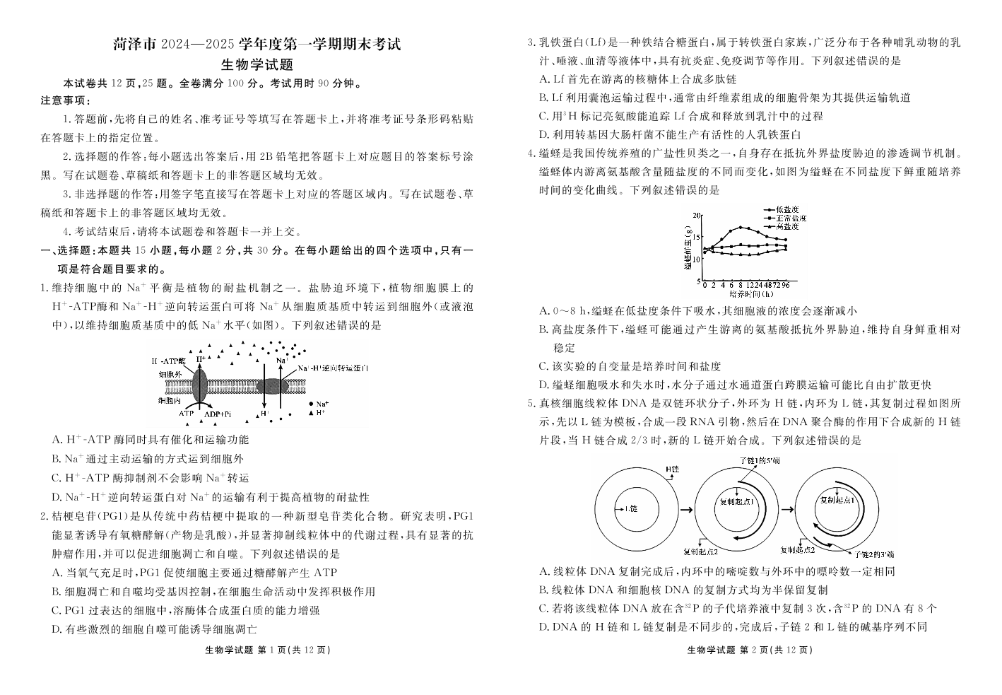 山东省菏泽市2024-2025学年上学期上学期1月高三期末考试生物