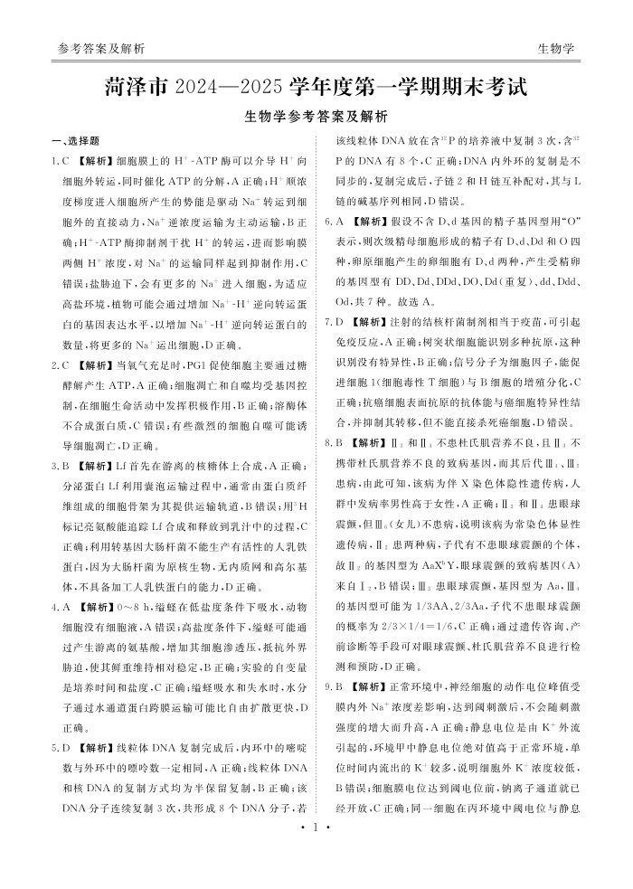 山东省菏泽市2024-2025学年上学期上学期1月高三期末考试生物答案