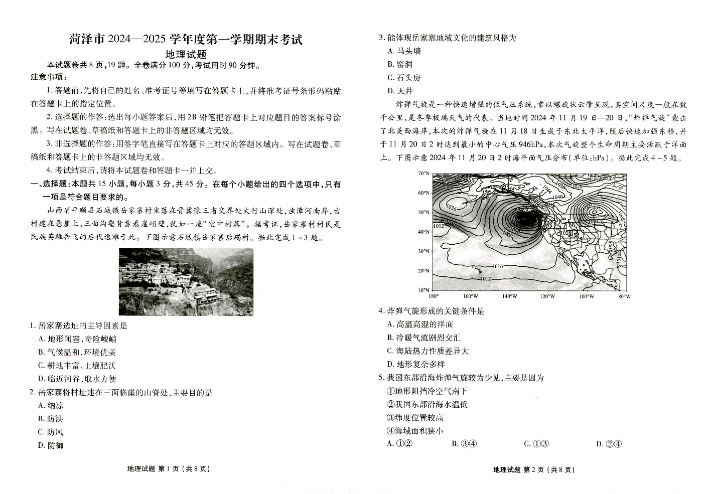 山东省菏泽市2024-2025学年上学期上学期1月高三期末考试地理