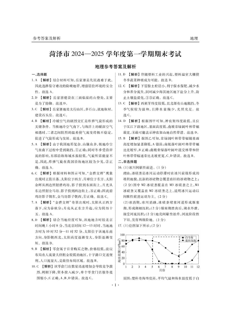 山东省菏泽市2024-2025学年上学期上学期1月高三期末考试地理答案
