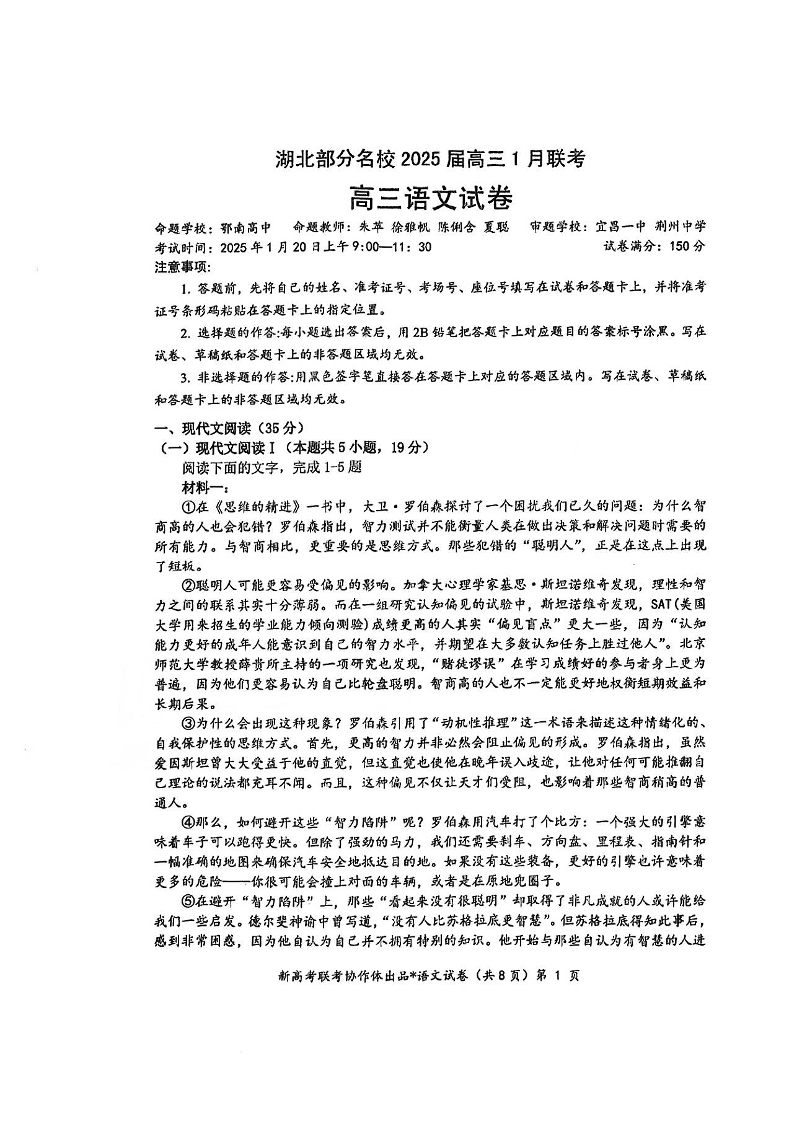 湖北省部分名校2024-2025 学年上学期1月高三期末联考语文