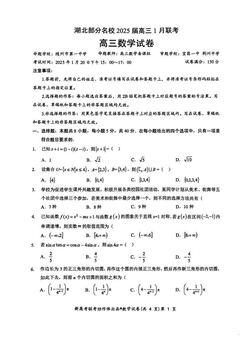 湖北省部分名校2024-2025 学年上学期1月高三期末联考数学