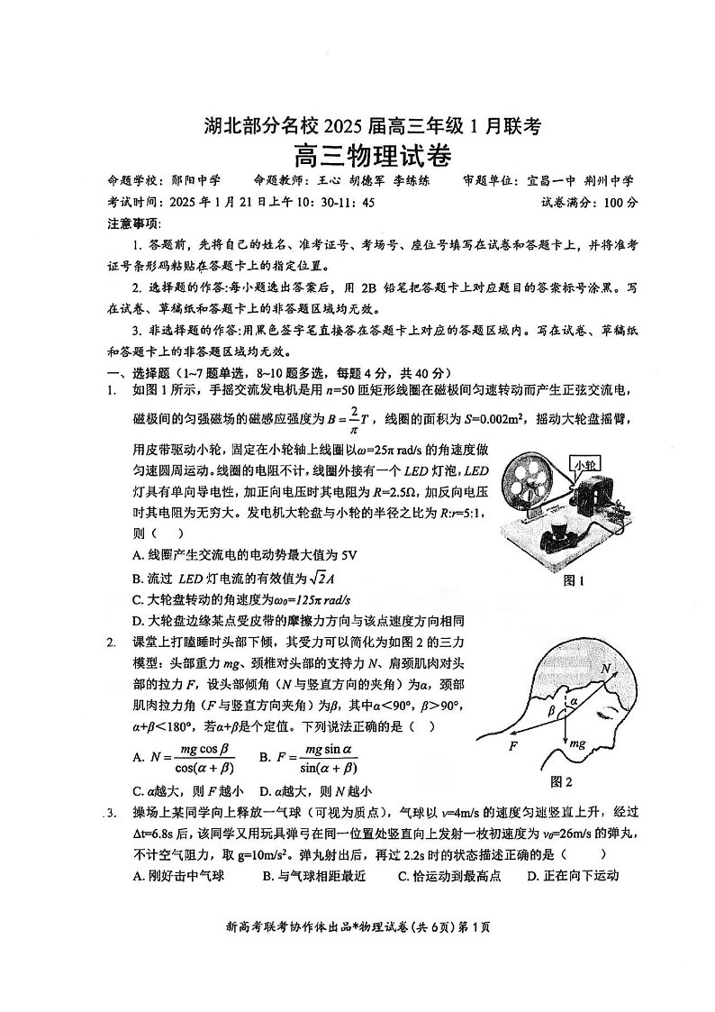 湖北省部分名校2024-2025 学年上学期1月高三期末联考物理