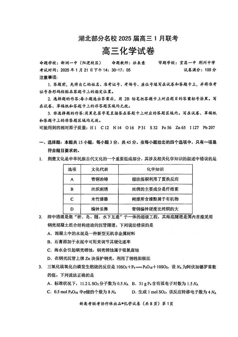 湖北省部分名校2024-2025 学年上学期1月高三期末联考化学