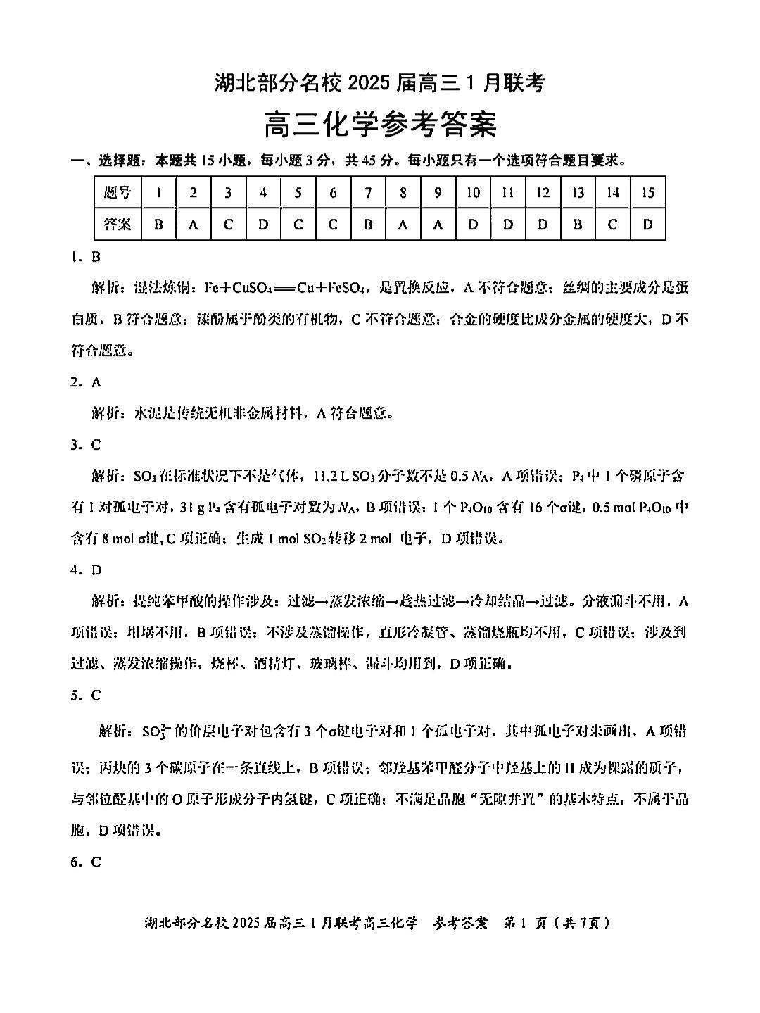 湖北省部分名校2024-2025 学年上学期1月高三期末联考化学答案