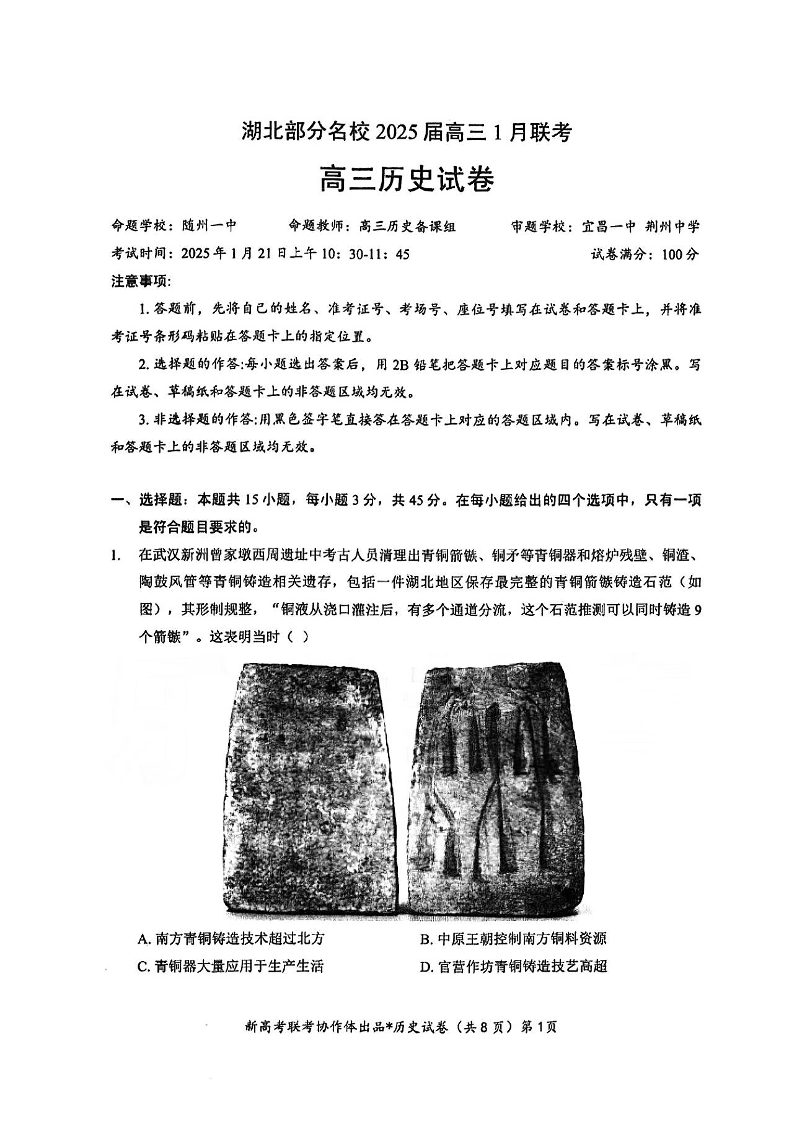 湖北省部分名校2024-2025 学年上学期1月高三期末联考历史