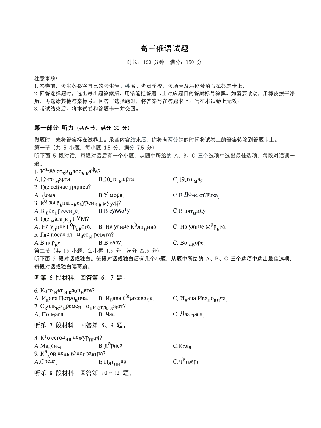 湖北省部分名校2024-2025 学年上学期1月高三期末联考俄语