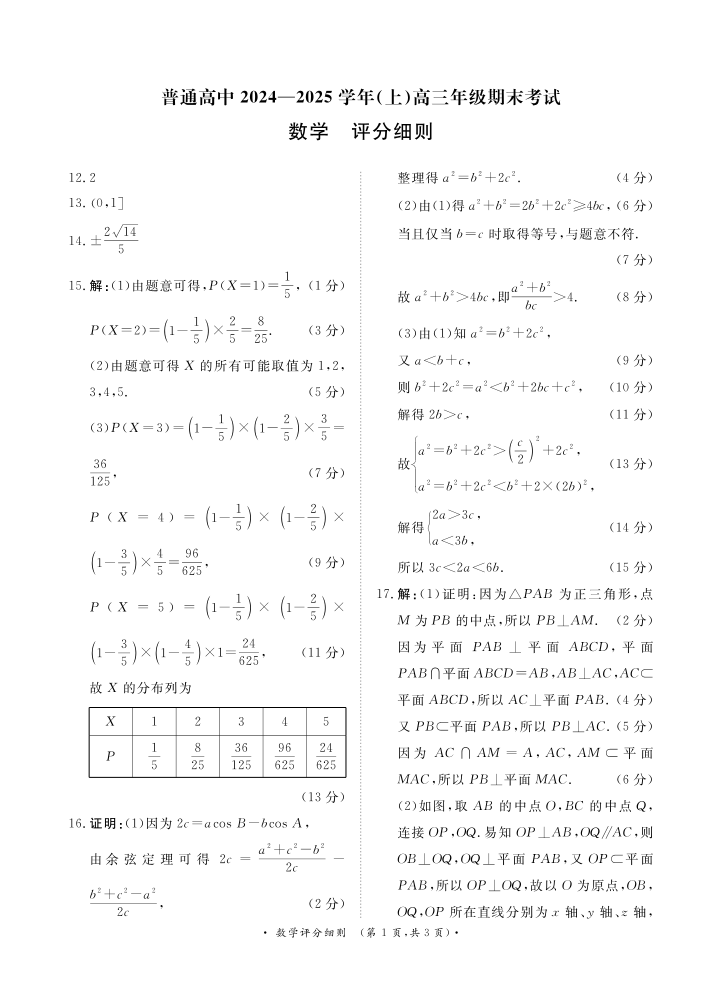 河南省区域高中2024-2025年上学期1月高三期末联考数学评分细则