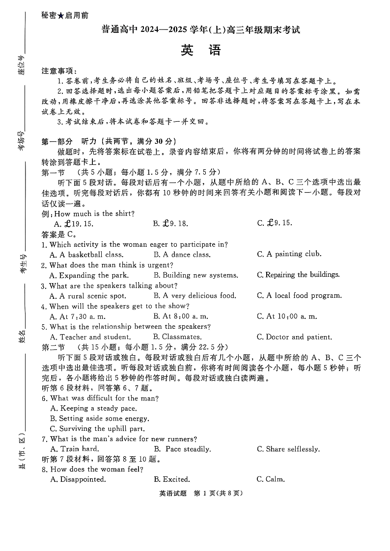 河南省区域高中2024-2025年上学期1月高三期末联考英语