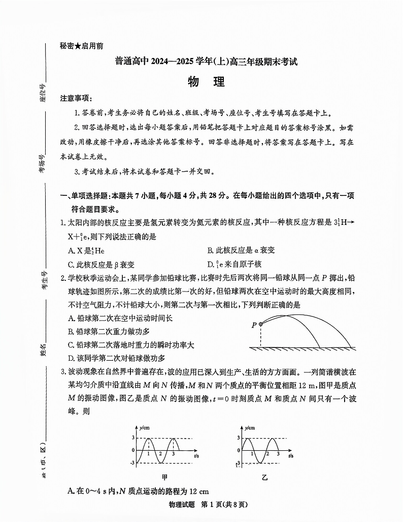 河南省区域高中2024-2025年上学期1月高三期末联考物理