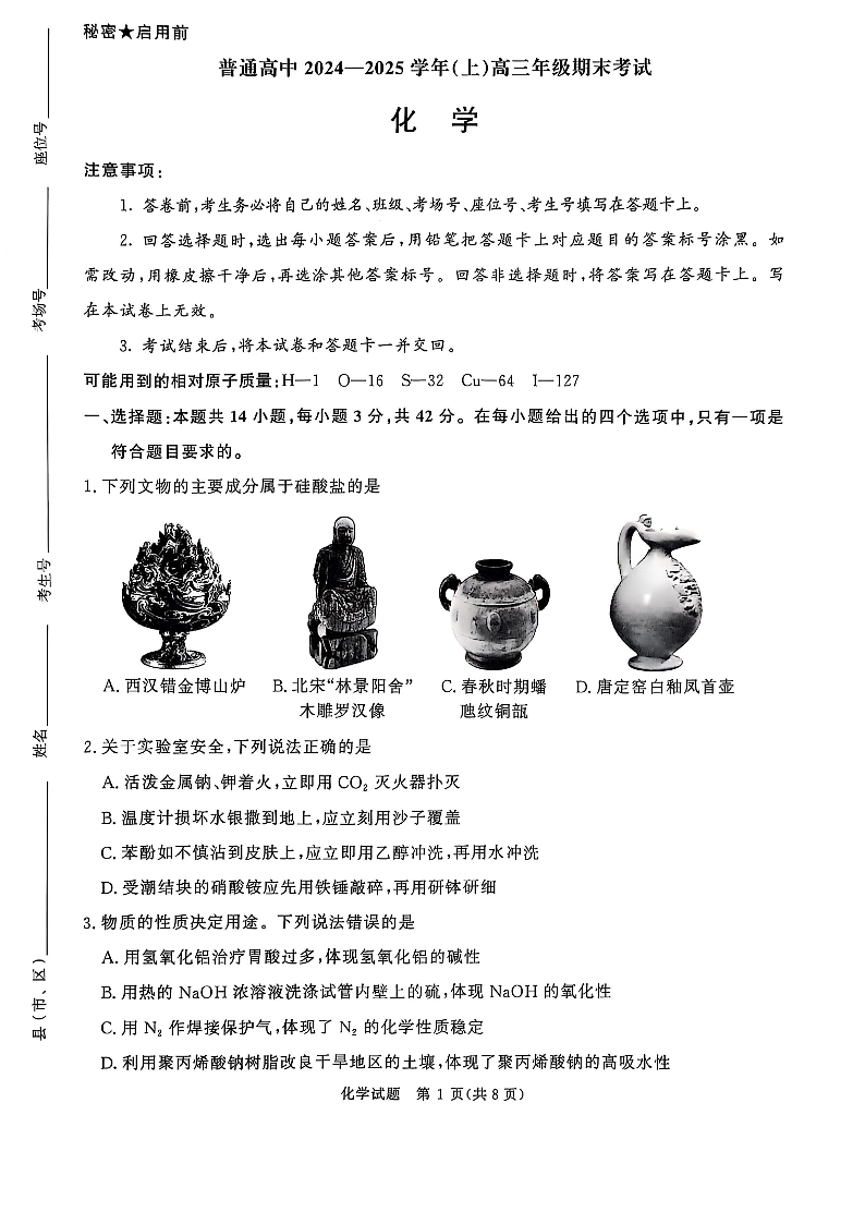 河南省区域高中2024-2025年上学期1月高三期末联考化学
