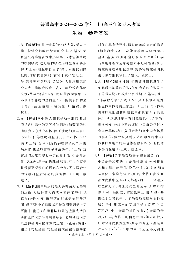 河南省区域高中2024-2025年上学期1月高三期末联考生物答案