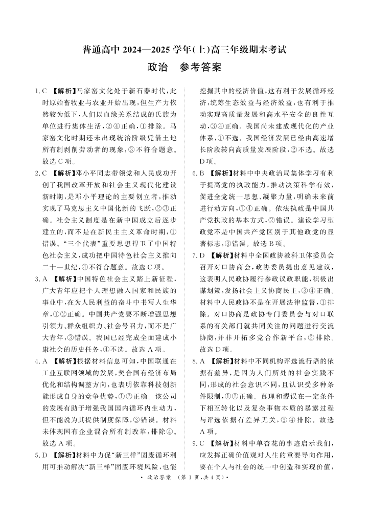 河南省区域高中2024-2025年上学期1月高三期末联考政治答案
