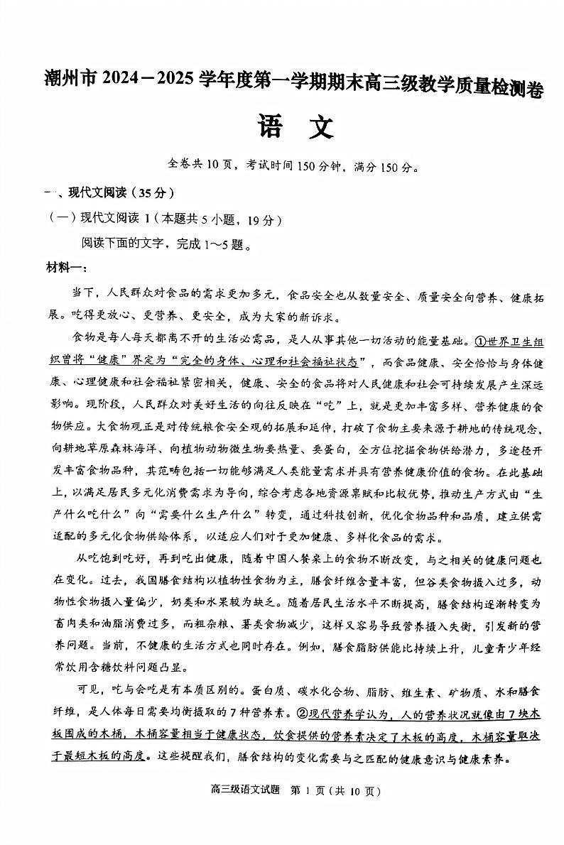 广东省潮州市20242025学年上学期1月高三期末教学质量检测语文