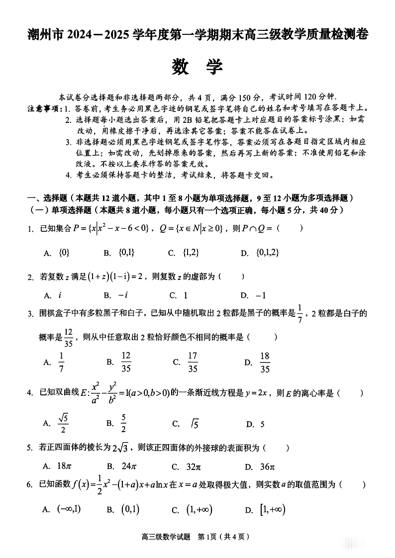 广东省潮州市20242025学年上学期1月高三期末教学质量检测数学+答案