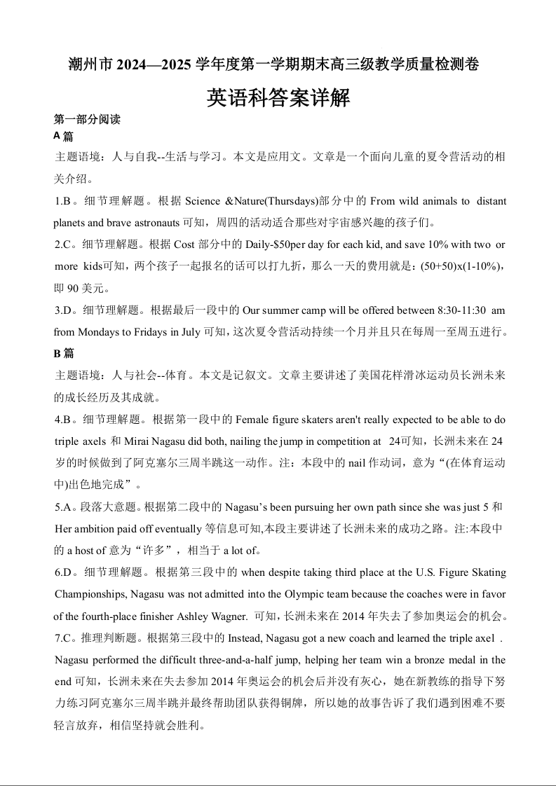 广东省潮州市20242025学年上学期1月高三期末教学质量检测英语答案