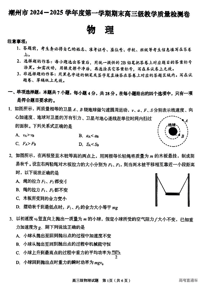 广东省潮州市20242025学年上学期1月高三期末教学质量检测物理+答案