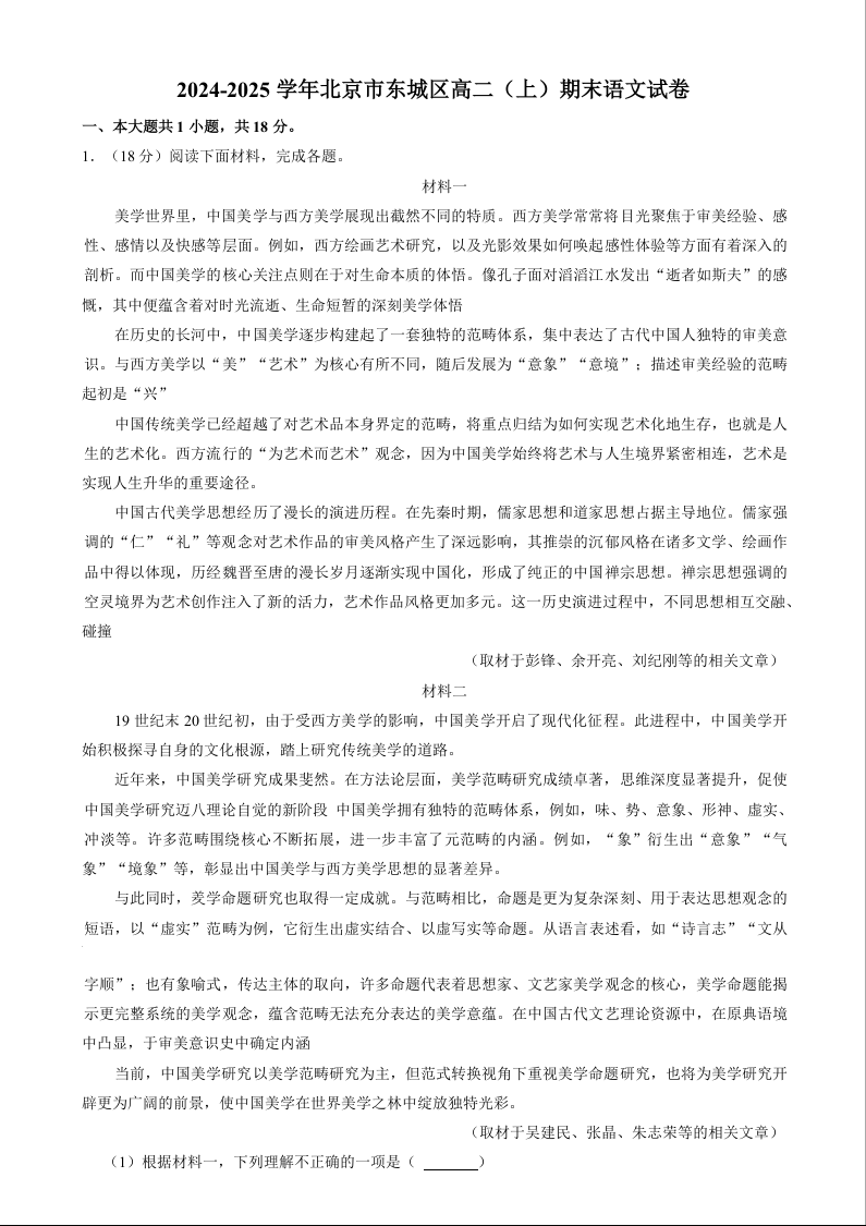 北京市东城区2024-2025学年上学期高二期末考试语文(原卷版+解析版)