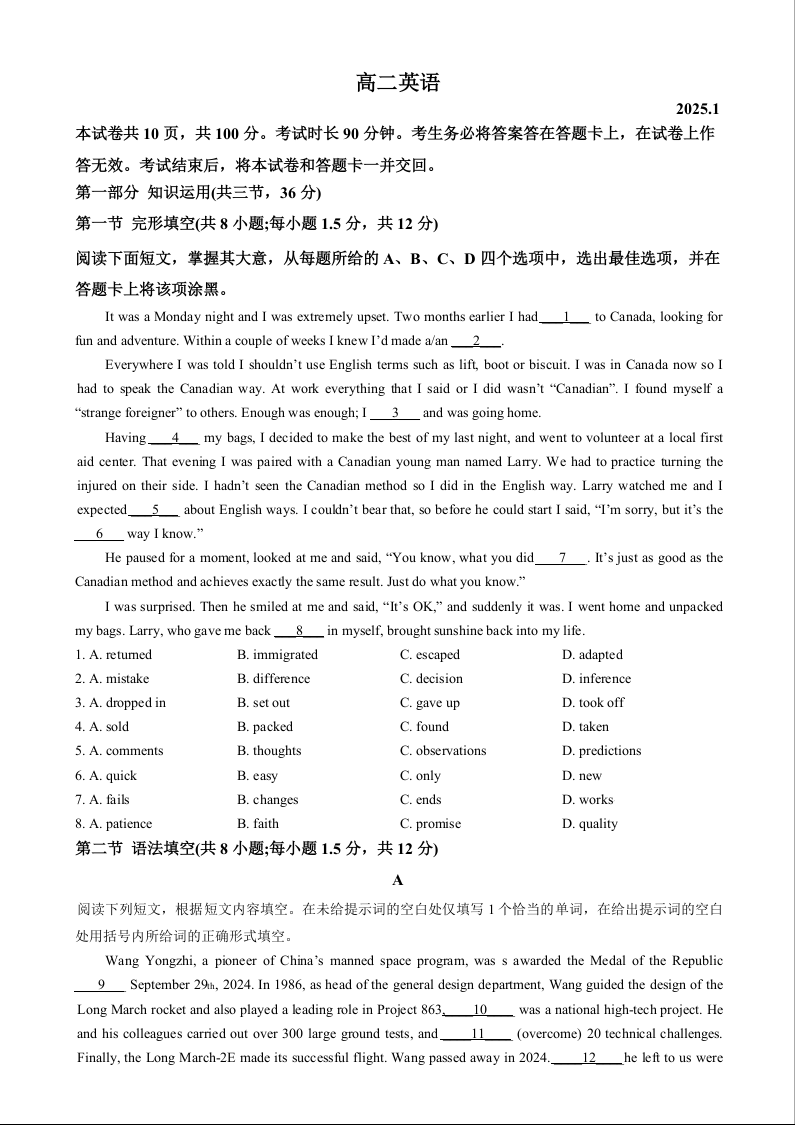 北京市东城区2024-2025学年上学期高二期末考试英语(原卷版)